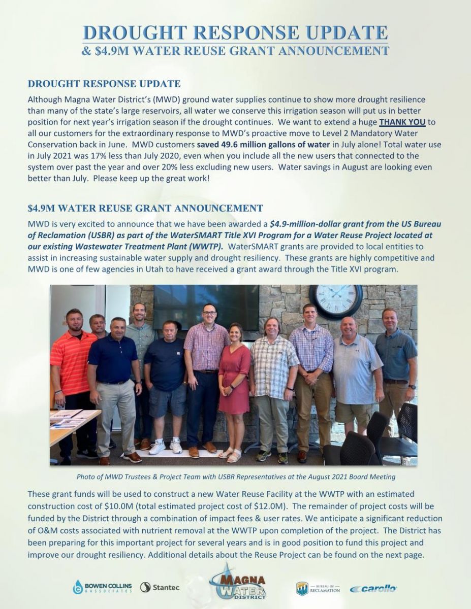 - Once online, the Water Reuse Project will significantly contribute to our district's water conservation efforts, providing a reliable water source for outdoor irrigation demands.