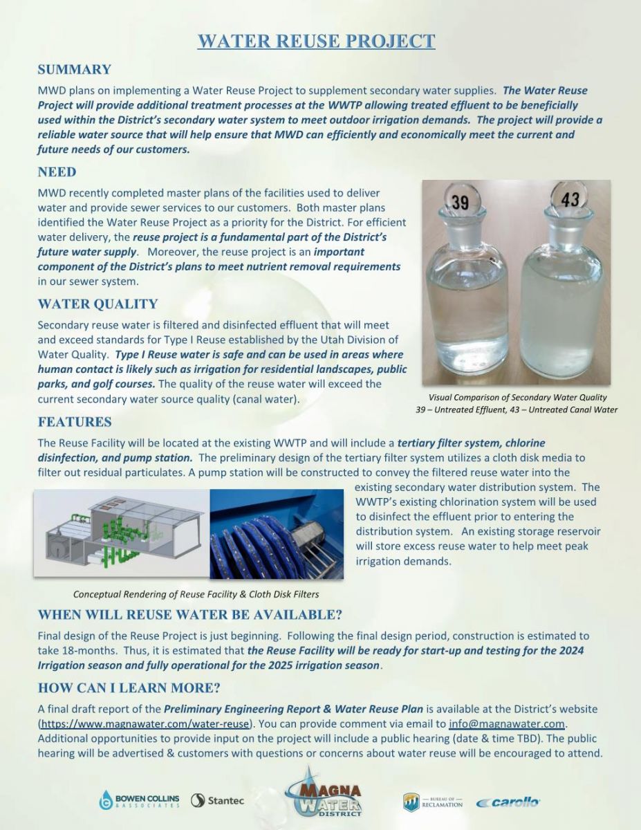 MWD plans on implementing a Water Reuse Project to supplement secondary water supplies. The Water Reuse Project will provide additional treatment processes at the WWTP allowing treated effluent to be beneficially used within the District’s secondary water system to meet outdoor irrigation demands. The project will provide a reliable water source that will help ensure that MWD can efficiently and economically meet the current and future needs of our customers.